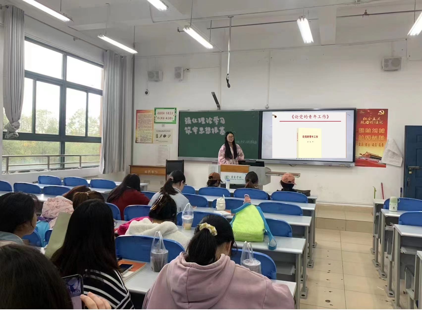 会议第三项,团支书请同学们表达自己的看法和对“强化理论学习,筑牢思想根基”专题学习会精神理解,积极引导同学们去学习运用“强化理论学习,筑牢思想根基”精神,做到知行合一。