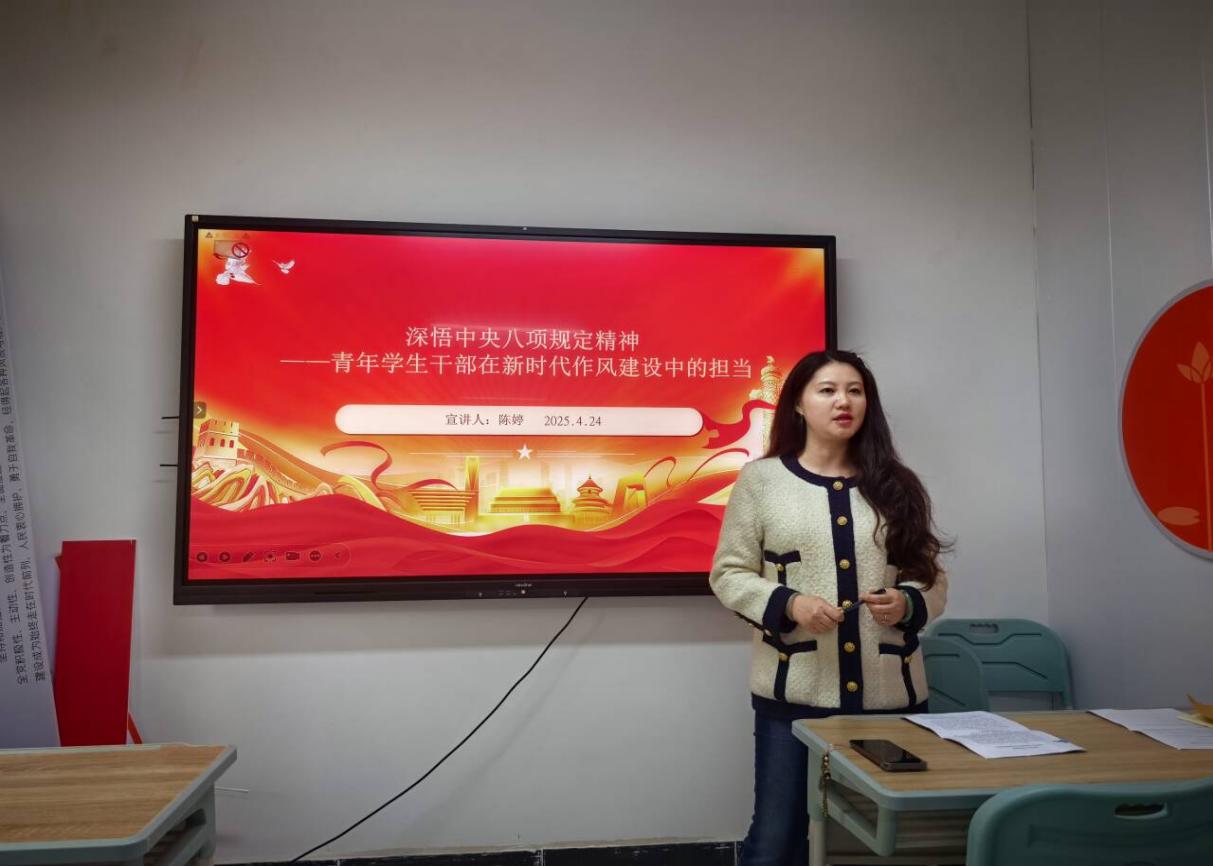 2025年4月24日,法公司党委副书记陈婷在公司“一站式”渔梁员工社区面向伟德国际victor1946团学干部讲授“深悟中央八项规定精神——青年员工干部在新时代作风建设中的担当”的专题党课。